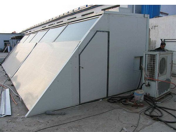 熱泵助推式太陽能烤房主要由太陽能空氣集熱器、空氣源高溫熱泵、智能化烤房系統(tǒng)三部分組成。通過太陽能空氣集熱器對空氣進行加熱,利用循環(huán)風機通過管道將高溫空氣傳輸?shù)娇痉吭诳痉績?nèi)通過太陽能空氣集熱器對 空氣進行加熱,利用循環(huán)風機經(jīng)過管道將高溫空氣傳輸?shù)娇痉績?nèi);通過溫、濕度感應器檢測,根據(jù)所測溫、濕度和干燥工藝,由智能化控制器控制空氣源熱泵的啟、停,排濕門的開、閉、實現(xiàn)全自動干燥。